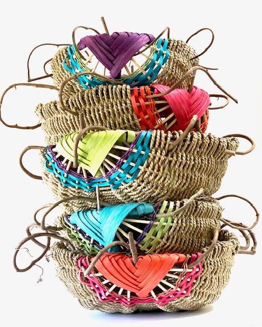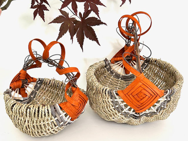 Baskets woven of sweetly scented sea grass with an intertwined rattan handle...