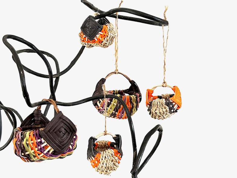 Handle-less baskets crafted from natural grapevine, colorful hand dyed rattan accents and...